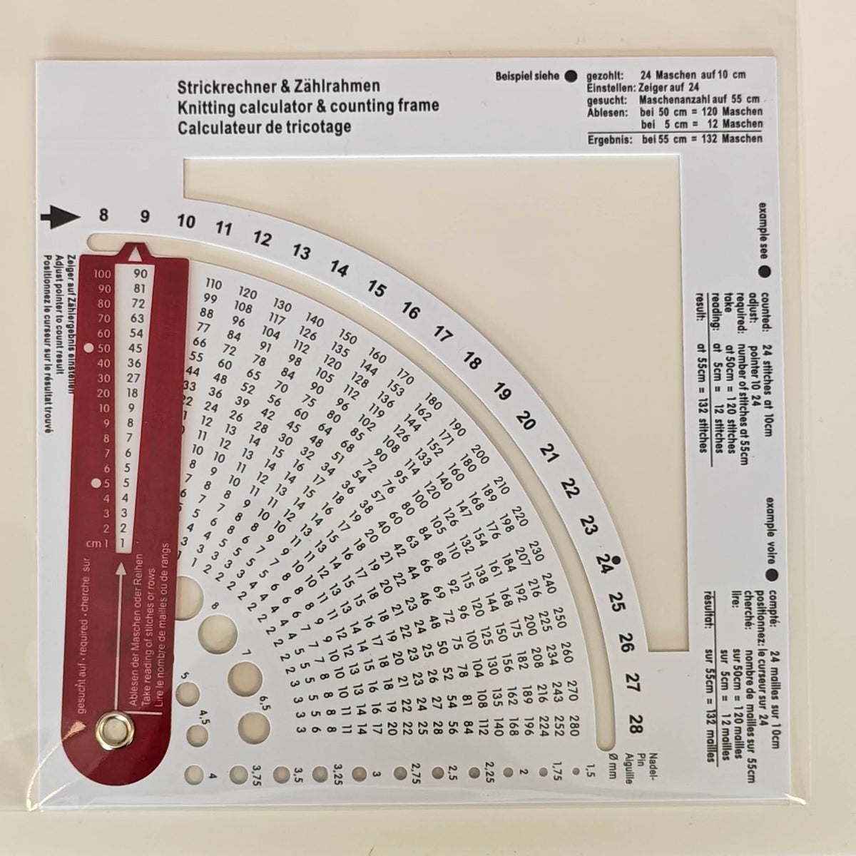 Käytännöllinen neulelaskuri usealla toiminnoilla. Laskuria voi käyttää puikkojen mittaamiseen, sekä neuletiheyden ja silmukoiden määrittämiseen. Asettamalla laskurin mallitilkun päälle voit mitata työhön tarvittavan silmukkamäärän ja kerrokset.