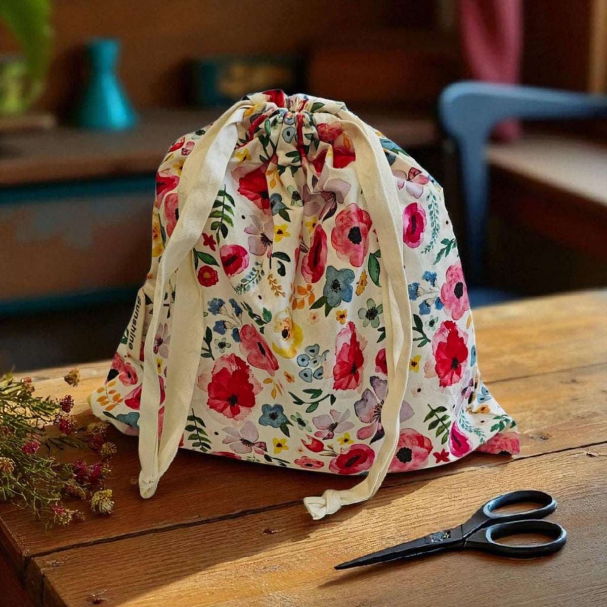 Kankainen neulepussukka puuvillanauha kiinnityksellä.