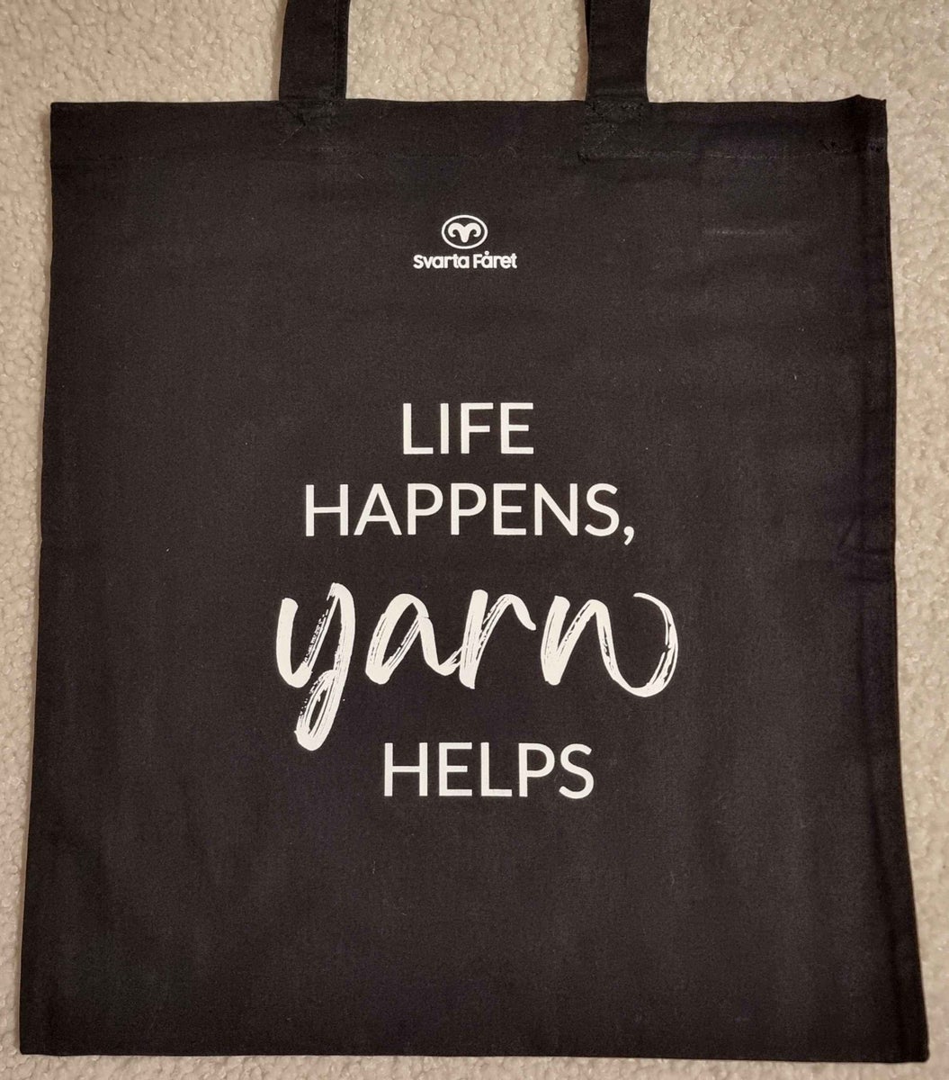 Luomupuuvillasta valmistettu kangaskassi tekstillä: Life happens, yarn helps ja Svarta Fåretin logolla.