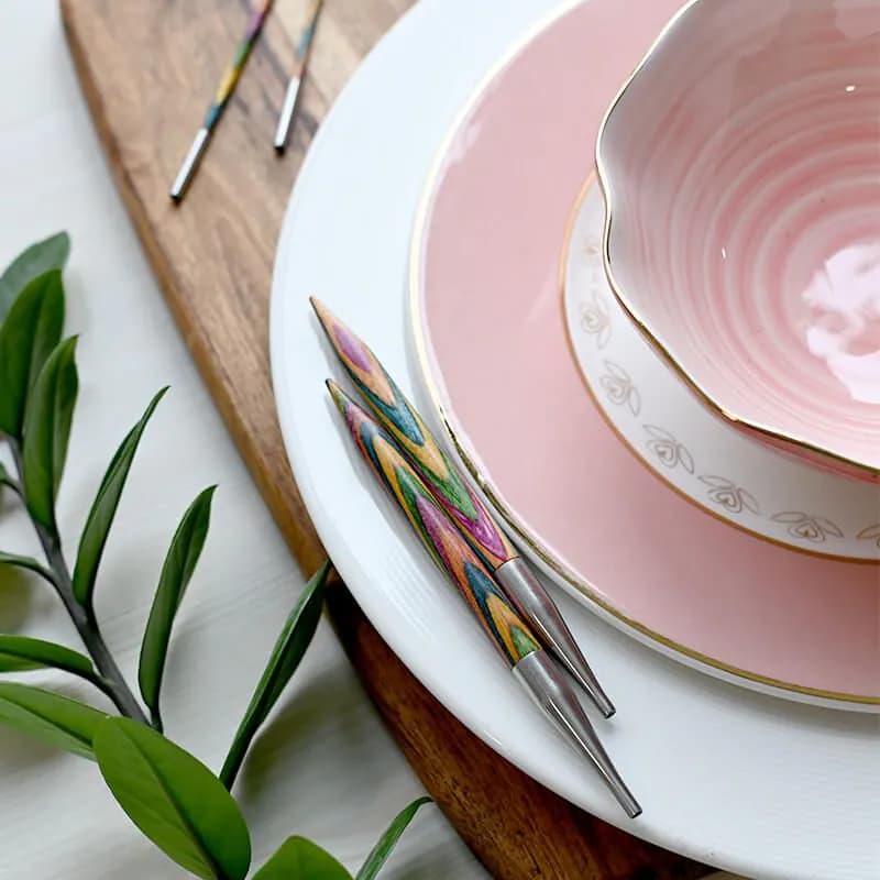 KnitPro Symfonie vaihtopäät ovat valmistettu kovasta käsitellystä koivusta, ja ne tarjoavat liukuvan neulonnan kaikilla lankatyypeillä ilman käsien väsymistä.