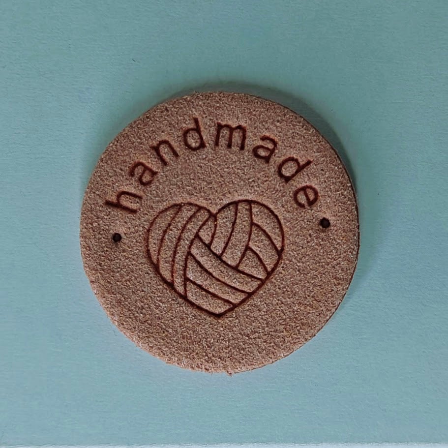 Kiinni ommeltava mokkajäljitelmä neulemerkki.